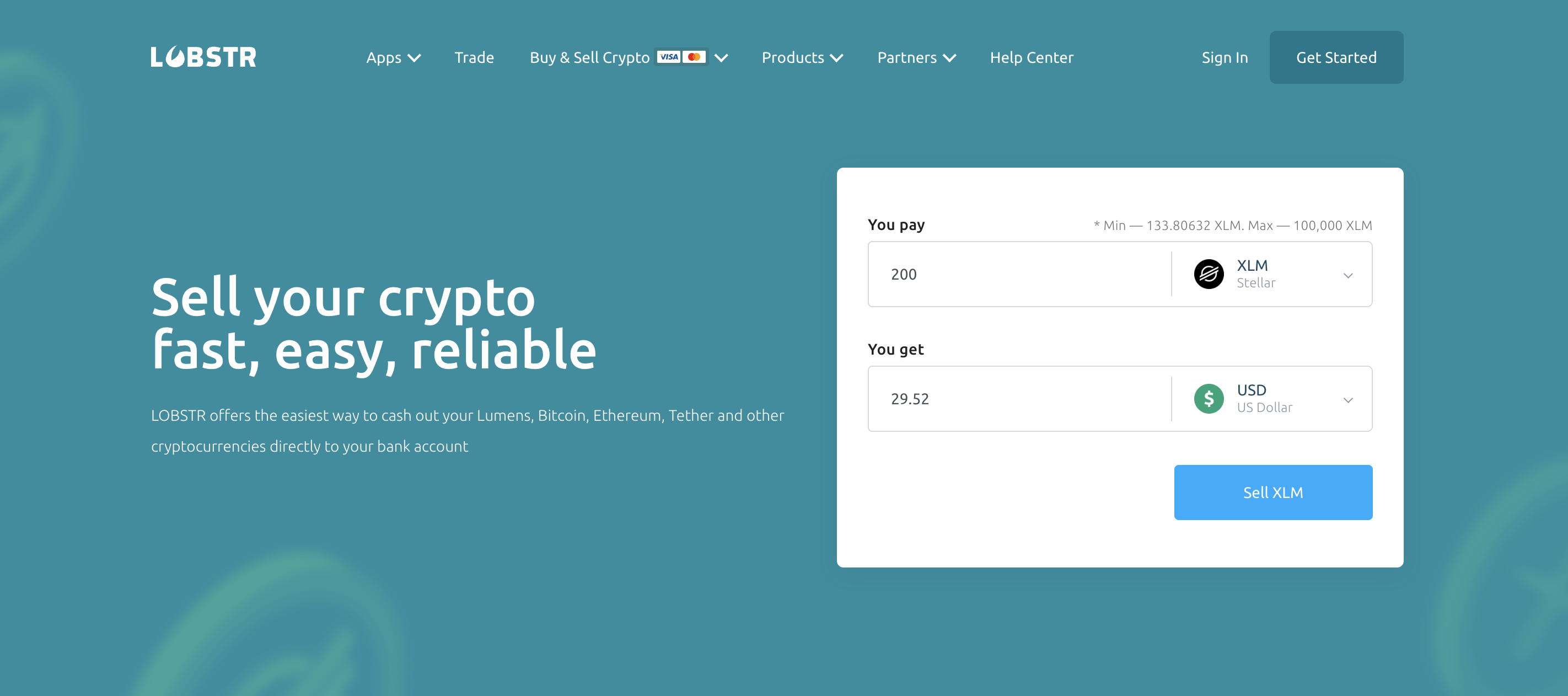 With LOBSTR, you can sell cryptocurrency (XLM, USDC, BTC, ETH, LTC, etc.) and get cash to your bank account through our partnership with MoonPay payment service.