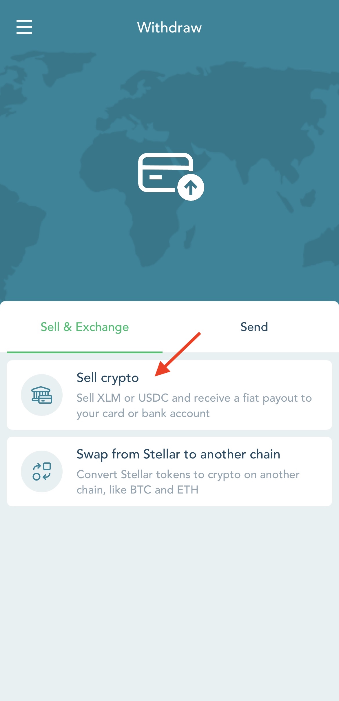 To cash out XLM and USDC, tap 'Withdraw' > 'Sell & Exchange' on the LOBSTR mobile apps or choose 'Buy & Sell Crypto' on the LOBSTR web.