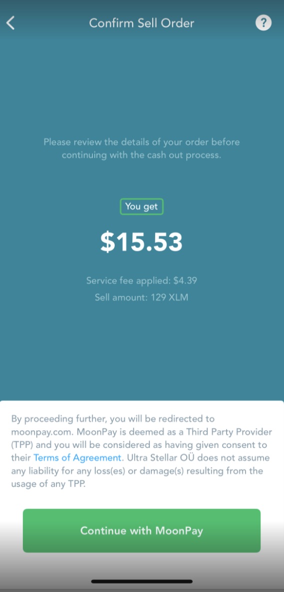 Please note that MoonPay always displays the fees on its page before you sell your crypto. You will always be in the know how much you're going to pay and how much it will cost you to sell your Lumens or other crypto.