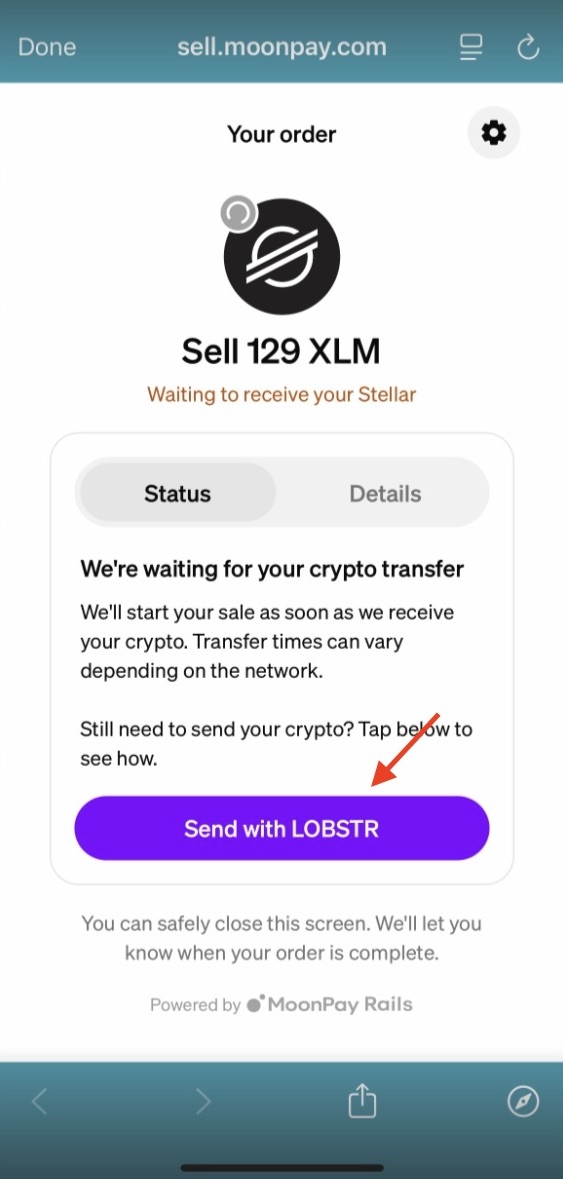 4. Edit the details on MoonPay's side, if necessary, and tap 'Send with LOBSTR'.