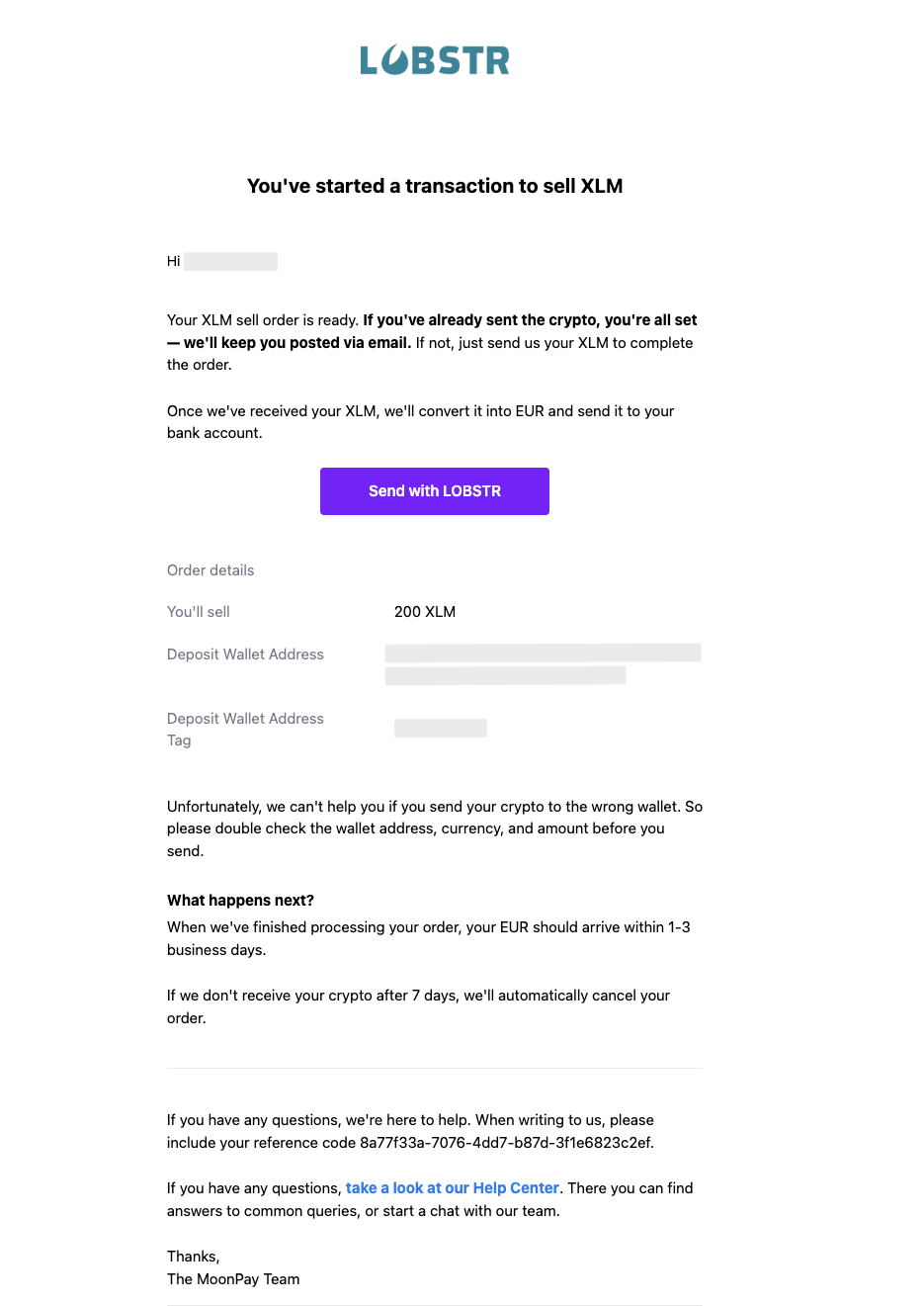 Please note: If you already sent your Lumens or other crypto to MoonPay, they won't be able to cancel the transaction anymore.