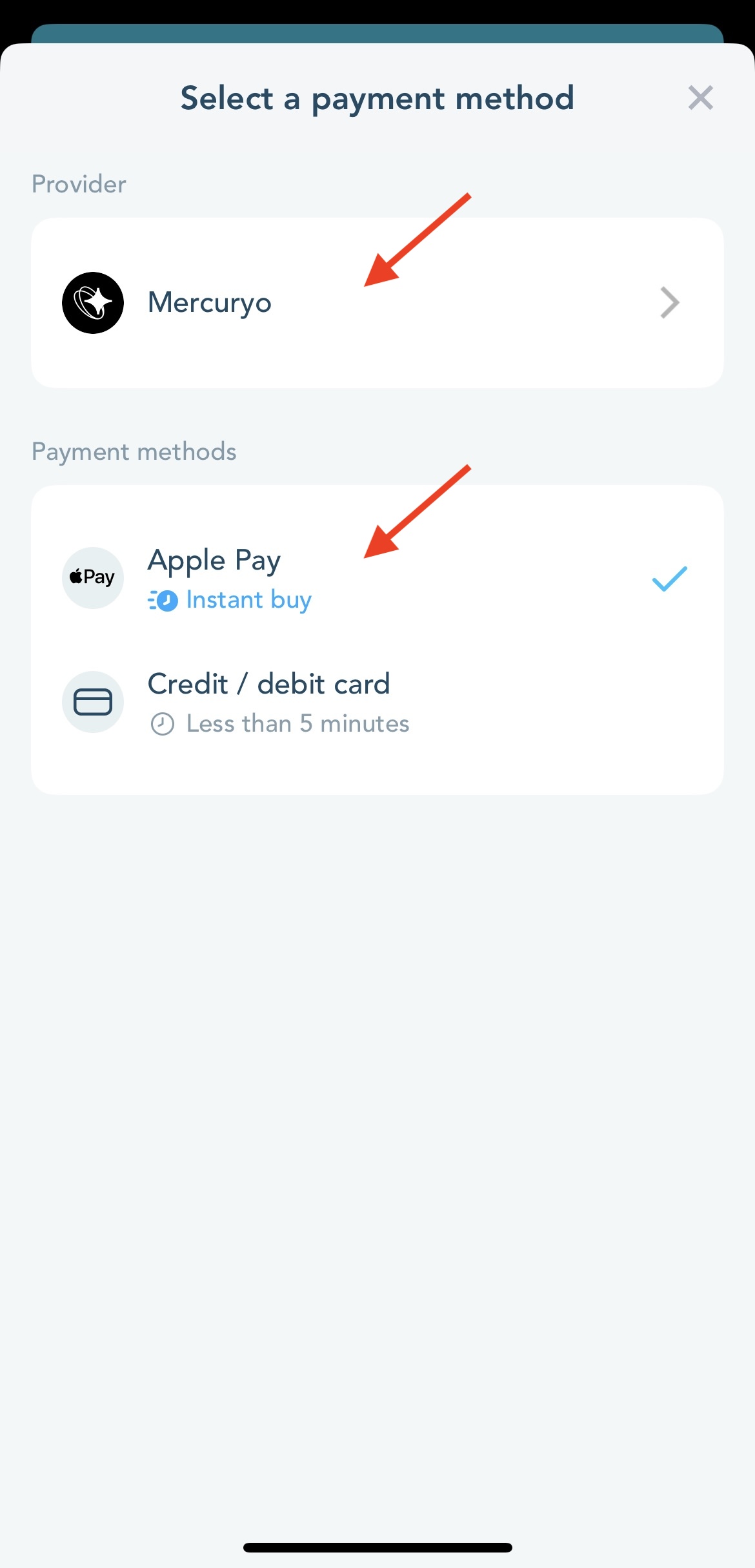 To top up your wallet with Mercuryo, navigate to 'Menu' > 'Buy Crypto', select the Mercuryo provider, and choose your preferred payment method.