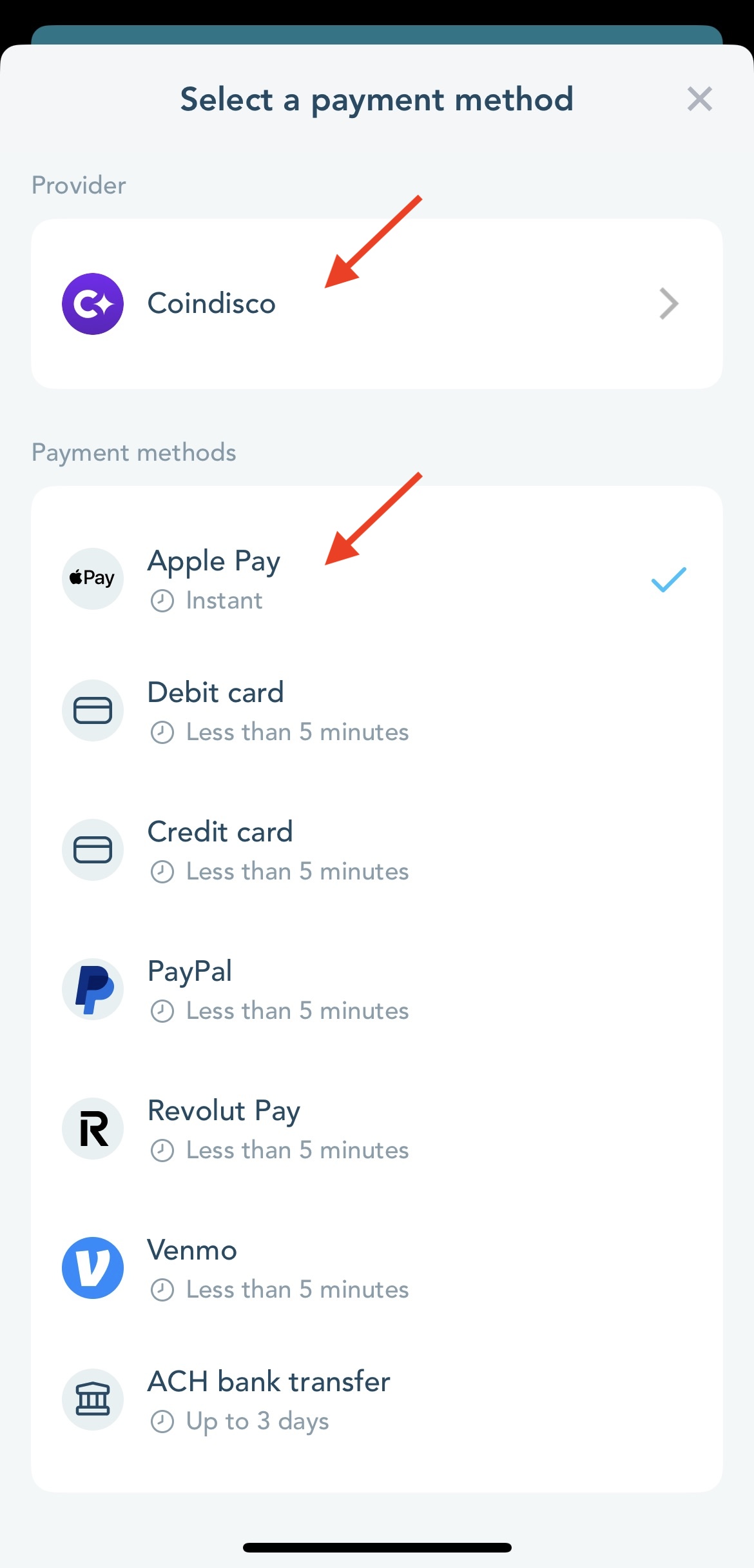 To top up your wallet, open the 'Asset Details' screen and select 'Buy USDC via Coindisco', or navigate to Menu > Buy Crypto > choose the Coindisco provider and your preferred payment method. Learn more