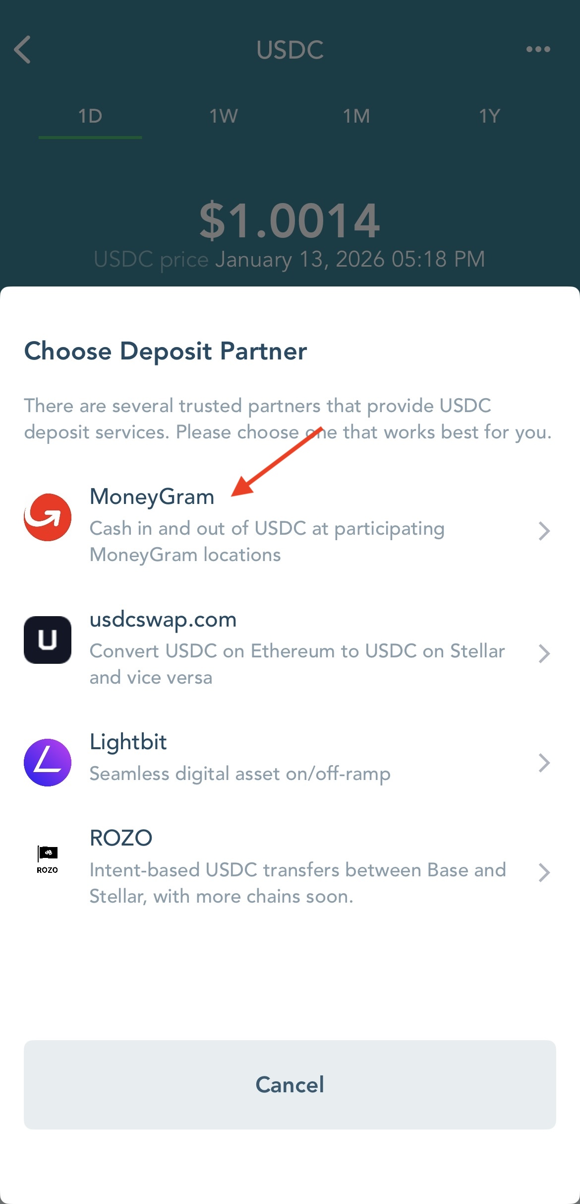 From the 'Home' screen on mobile apps or 'Assets' screen on the web > select USDC by centre.io > tap 'Deposit USDC' > choose 'MoneyGram' to start the cash in process.