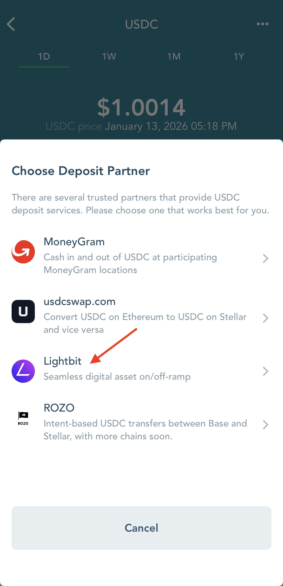 With Lightbit, you can purchase Stellar USDC into your LOBSTR account. From the 'Home' screen on mobile apps or 'Assets' screen on the web > select USDC (by centre.io) > tap 'Deposit USDC' > select 'Lightbit' > follow the instructions on the screen.