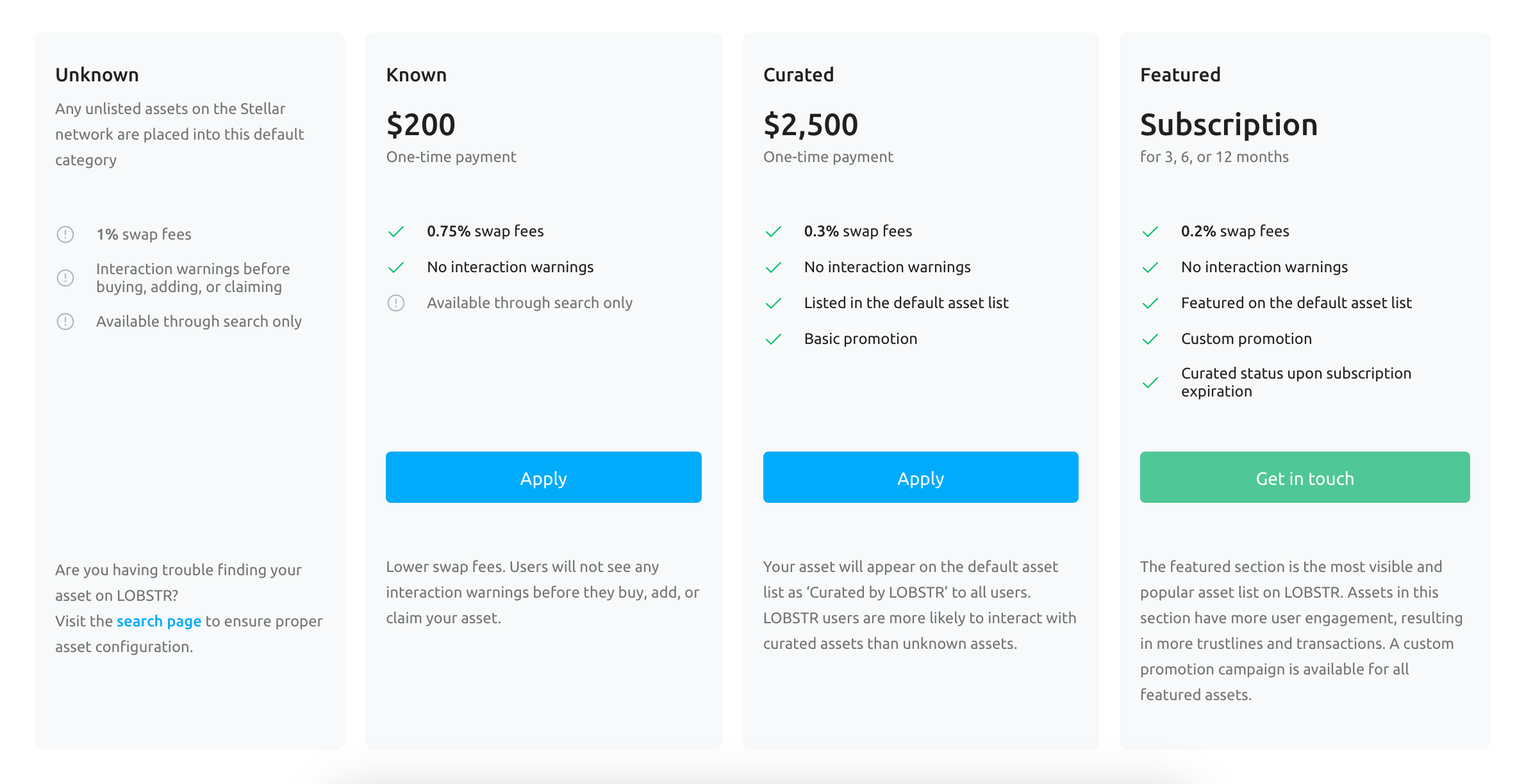 Listing in the Known category allows for lower swap fees for asset users at 0.8%. Users also will not see any interaction warnings before they buy, add, or claim your asset on LOBSTR.