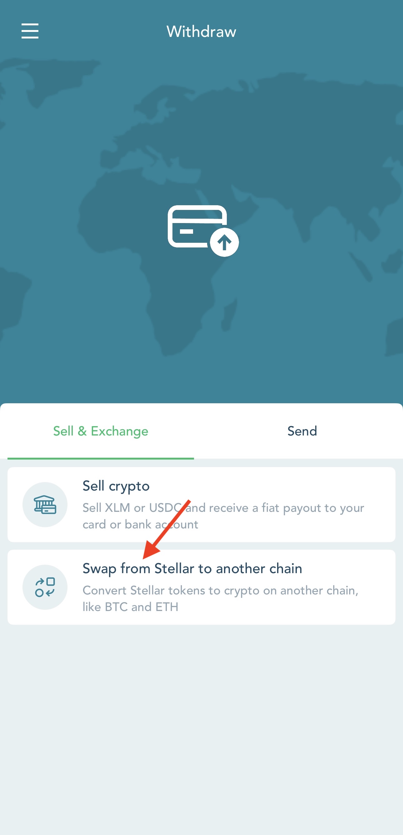 1. Tap 'Withdraw' in the side menu of LOBSTR mobile apps > select 'Sell & Exchange' > select 'Swap from Stellar to another chain' > choose 'Near intents'.