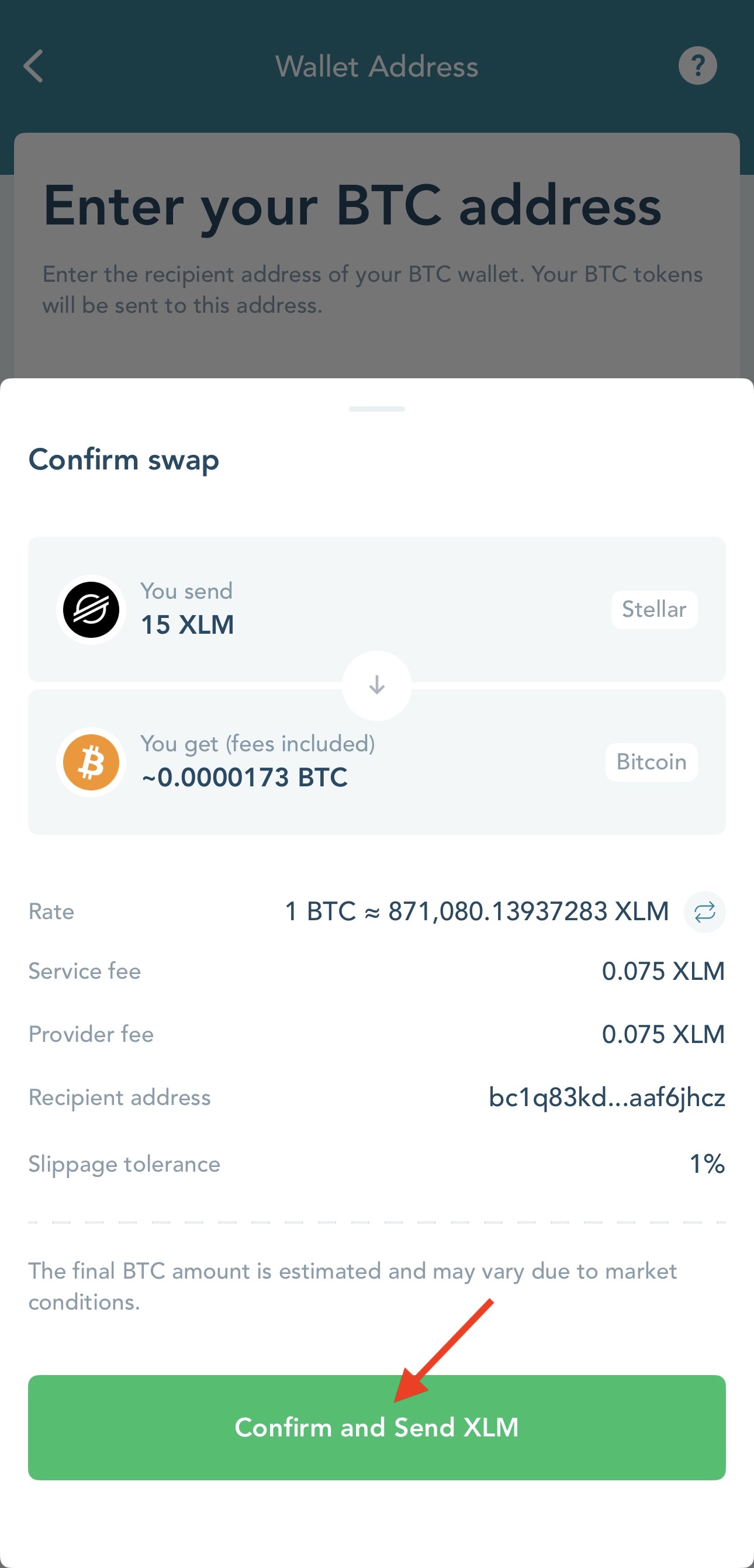 The final amount of non-Stellar tokens you will receive can be more or less than quoted due to market price changes.